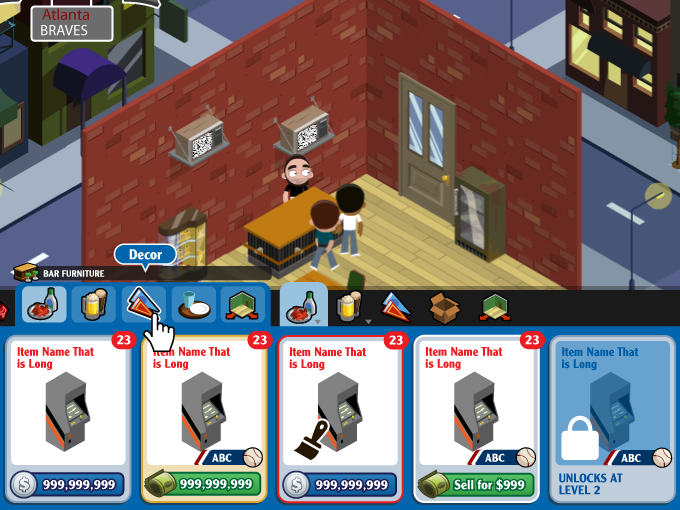 Build the Sports Bar of your dreams! The game gives fans a virtual destination to run their own sports bar & grill, win over loyal customers, decorate walls with sports paraphernalia, show simulated live and on-demand games via flatscreens, get real-time scores and news, interact with friends and their sports bar & grills and more.